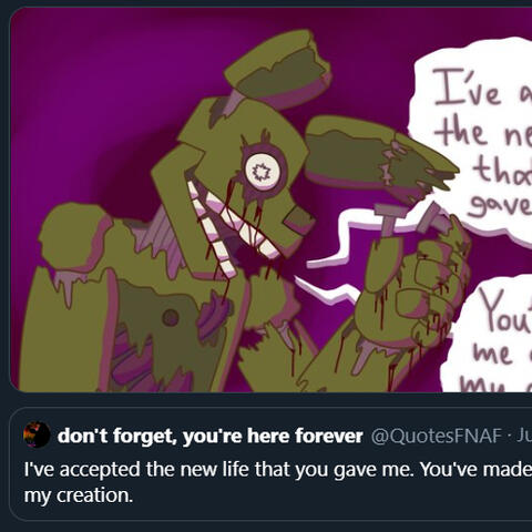 Every two weeks, a quote is selected from the bot and linked below! Make art based off of it and include "#fnafquoteart" in the description, and it will be retweeted to the QuotesFNAF account!