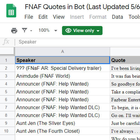 Click the button link to check out the spreadsheet for the quotes, as well as what games/books/etc and which characters they come from.